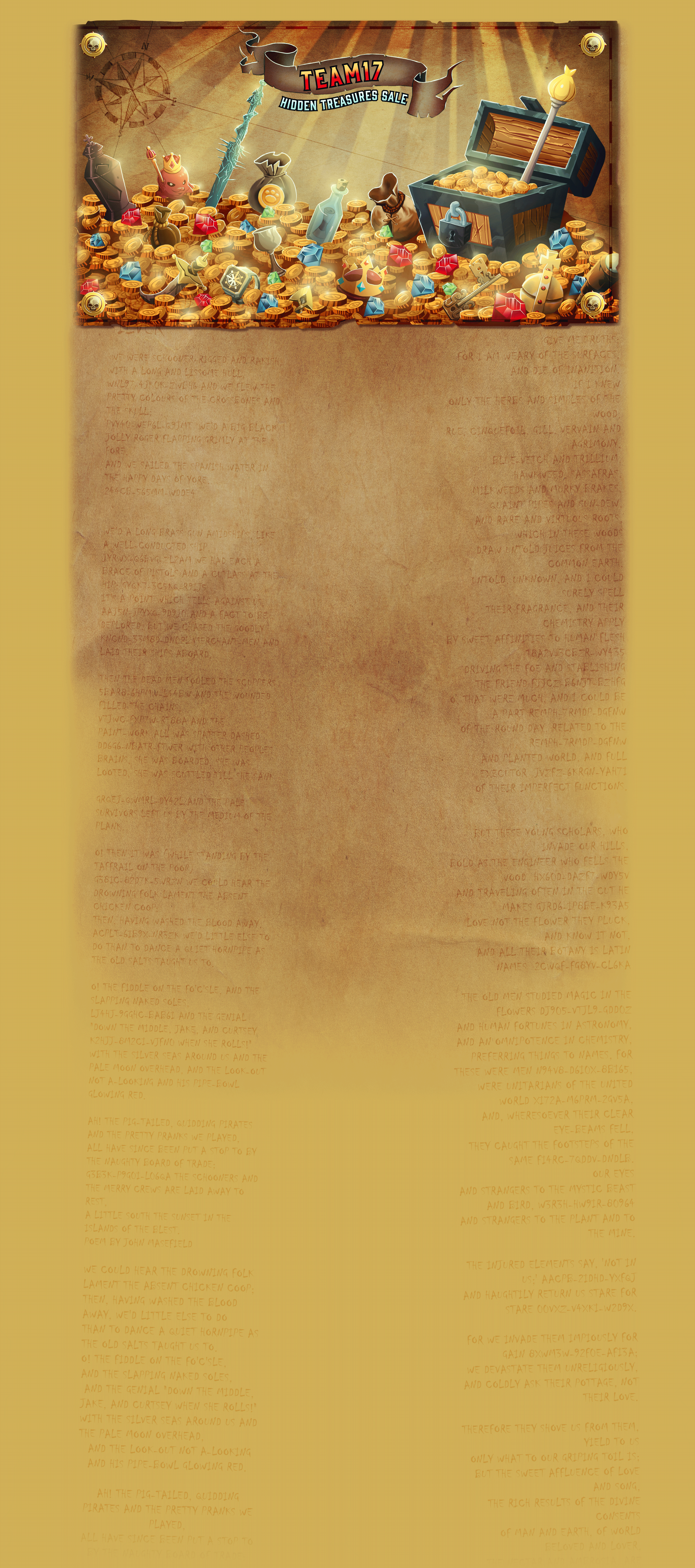 But the best deals were hidden in plain sight. Over on the Hidden Treasures Steam event page, you can spot a pirate-themed background filled with gold and treasure. If you scroll down and look past the game deals, you’ll spot faint writing on what looks like parchment paper. And it’s buried in these words that you’ll also notice some alphanumeric codes, which are in fact keys for different Team 17 games.
