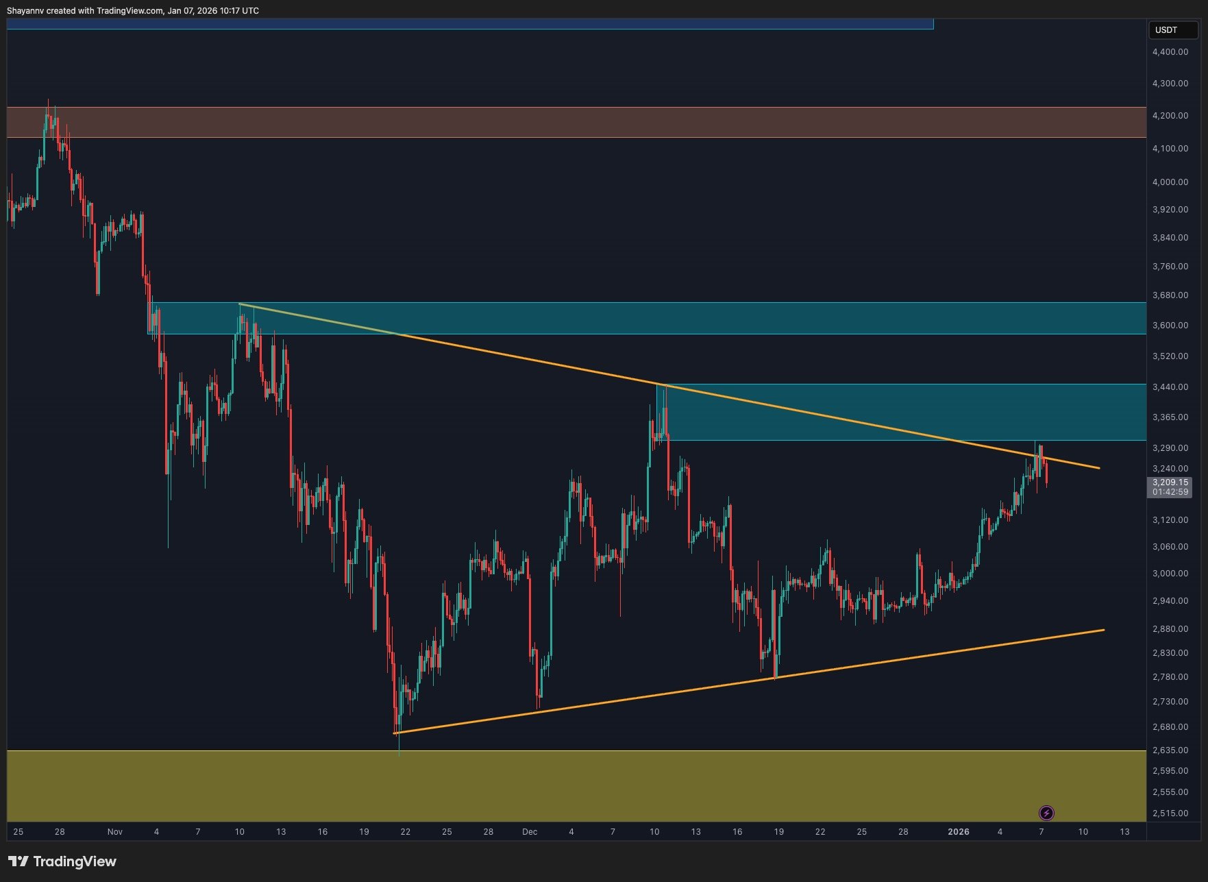 This breakout reflects improving short-term momentum, but it does not yet confirm a full trend reversal. The blue resistance box above, bounded by the $3.3K-$3,450 thresholds, remains the primary obstacle for continuation, as the price has previously reacted sharply from this zone. A clean acceptance above this area would be needed to confirm sustained bullish continuation, while rejection could lead to another pullback toward wedge support or the mid-range levels.