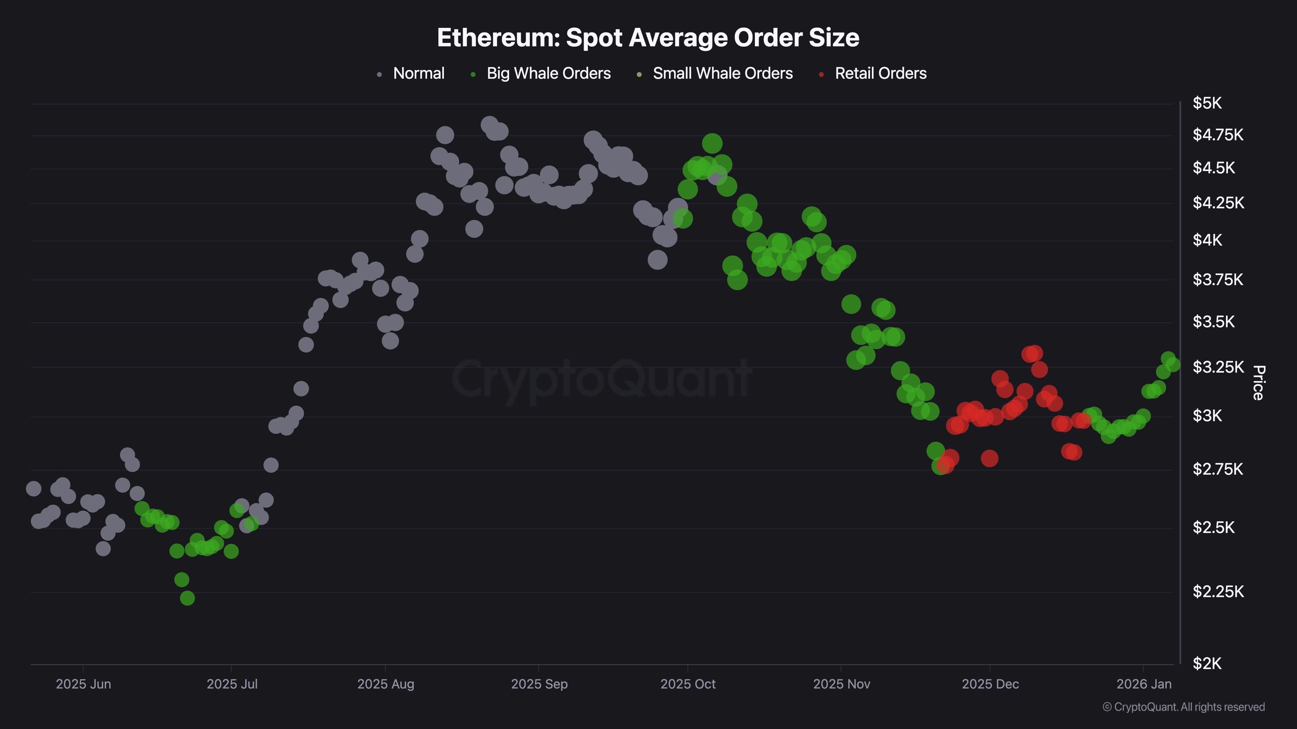 From an on-chain perspective, the Ethereum Spot Average Order Size chart shows an important behavioural shift. The recent appearance and clustering of green spots indicate increased participation from whale-sized spot buyers during the current price recovery. This suggests that larger participants are becoming active again after a period dominated by retail-sized orders.