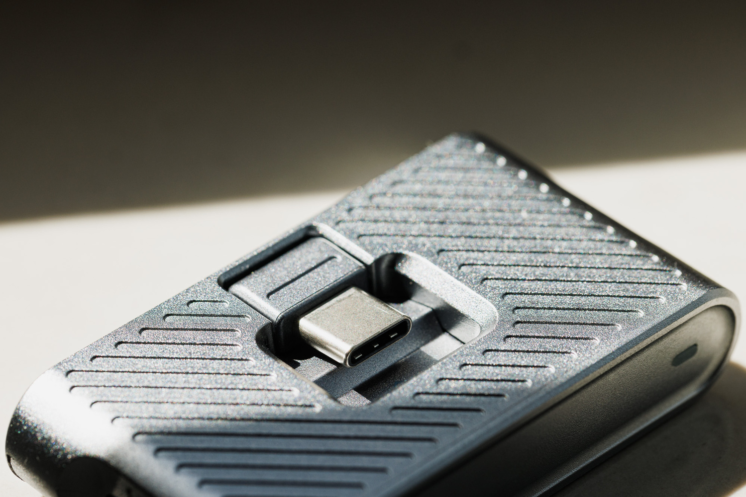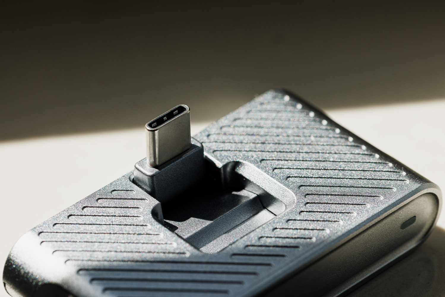You can also find two other USB-C ports on each side of the SSD for mic input and up to 65 W power delivery. As mentioned previously, they are not for data transfers out of the SSD drive, though you can use the mic input port to connect to other external drives for data transfer to the host—this port supports a transfer speed of up to 480 Mbps. It is worth pointing out that the foldable port sits quite closely to the edge of the casing, not in the middle of the SSD. This smart design choice allows the phone or your laptop to sit completely flat on the table with the SSD plugged in.